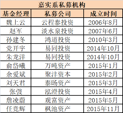 嘉实系的代表当属淡水泉投资,2007年正当风头的明星基金经理赵军和几位嘉实基金同事离职,创办了淡水泉投资,如今已经成为业内翘楚。当然,赵军也并不是嘉实基金最早奔私的基金经理,曾在嘉实基金任职的魏上云2006年就创办了云程泰投资。