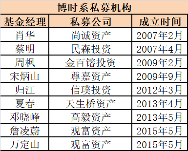 2007年初,博时基金的明星基金经理肖华创办了尚诚资产,他是当时业内管理单只基金时间最长的基金经理;而后早年博时基金主管投资的副总裁蔡明创办民森投资,民森投资很长时间是深广地区大私募的代表;2009年,创立金百镕投资的周枫以及创立尊嘉资产的宋炳山,也都曾任职博时基金;而后2012年-2015年间,归江、夏春、邓晓峰、詹凌蔚、万定山等博时系精英也纷纷进入道私募行业。