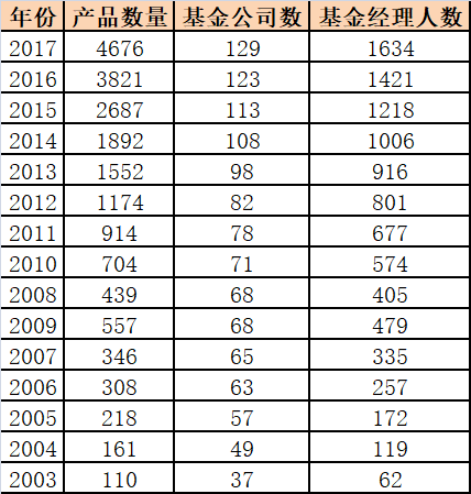 当然,基金经理这一金领职业的人数每年都在不断增长,这背后是基金产品、基金规模和经济公司数量的增长。2003年底,基金公司数量为37家,基金产品数量为110只,管理的公募资产规模为1715.61亿元;到2017年10底,基金公司数量增至129家,基金产品数量达到4676只,管理的公募资产规模为11.34万亿元。