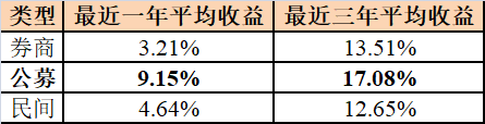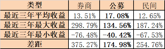 最近3年A股市场经历市场波动。公募派整体仍取得了17.08%的平均收益,而券商派、民间派私募的平均收益分别为13.51%、12.65%。