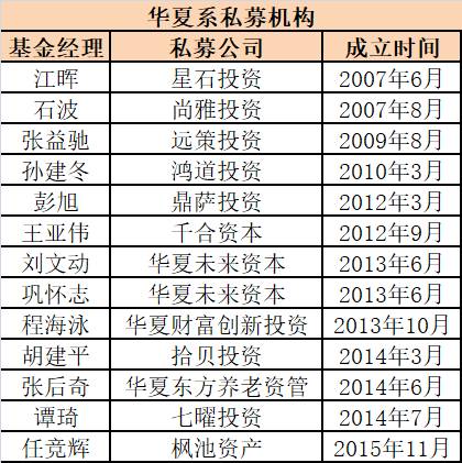王亚伟之后,又有刘文动、巩怀志、程海泳、胡建平等多位大咖投身私募。2013年,刘文动、巩怀志几位华夏基金的原同事合伙创办了华夏未来资本,同年程海泳创立了华夏财富创新投资,两位合伙人也曾在华夏基金任职,这两家私募的名称中都有着他们曾经任职的公募基金“华夏”二字。2014年,曾在华夏基金任职的胡建平,创立了拾贝投资;曾在华夏基金任职的谭琦创立了七曜投资;原华夏基金副总经理张后奇创立了私募夏东方养老资产管理公司,也带“华夏”二字;2015年创立枫池资产的任竞辉,也曾在华夏基金任职。