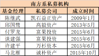 邱国鹭之前,南方基金系的精英创立私募,较早的要数陈继武2009年创立凯石投资,在从富国基金出来投身私募之前,陈继武曾在南方基金工作;而后就是2015年创立富果投资的谈建强与付罗龙都来自南方基金,创立万杉资本的许建平、创立诚朴资产的马北雁也都曾是南方基金的基金经理。