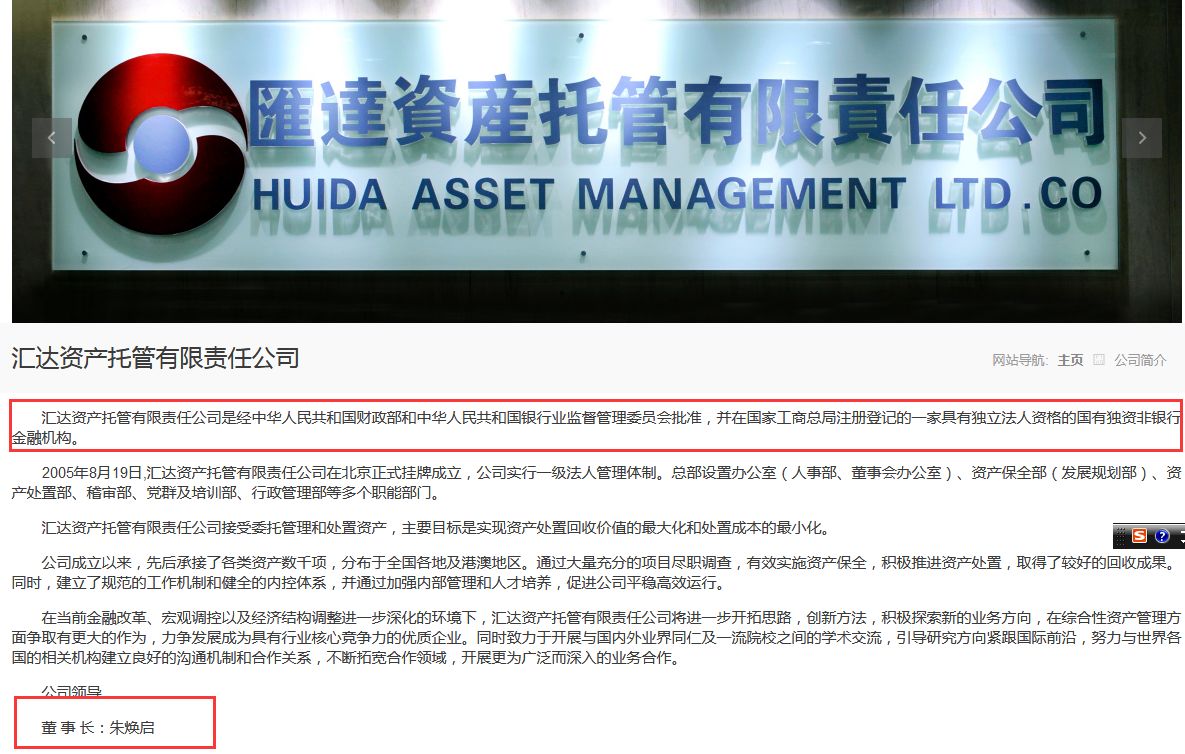资料显示,百行征信董事长及总裁为汇达资产托管有限责任公司董事长朱焕启。据汇达资产托管官网介绍,其是经财政部及银监会批准的具有独立法人资格的国有独资非银行金融机构。