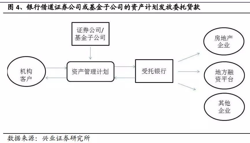 这样大量的银行理财资金对接到定向或者专项资产管理计划,然后由证券公司或基金子公司作为委托人,最终以委托贷款的形式投向房地产、地方融资平台等领域。