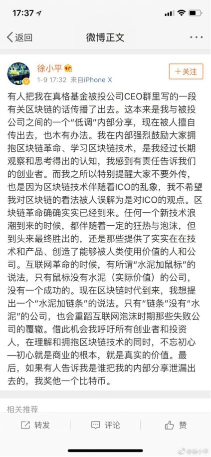 在上述内容外传出去之后,他在微博进一步解释,称其在内部强烈鼓励大家拥抱区块链革命、学习区块链技术,是经过长期观察和思考得出的认知。区块链革命确确实实已经到来。