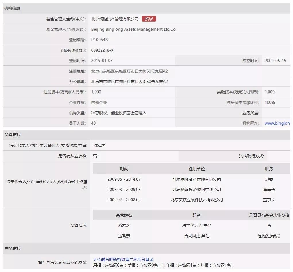 备案信息显示,北京炳隆资产管理有限公司成立于2009年5月15日,备案于2015年1月7日,注册资本为1000万元,属于私募股权、创业投资基金,蒋宏炳登记为公司法定代表人、总裁,无基金从业资格,公司员工总数为40人。