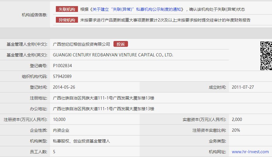 备案信息显示,广西世纪红榕创业投资有限公司成立于2011年7月27日,备案于2014年5月26日,注册资本为1个亿,实缴比例20%,黄冠杰为公司法定代表人、总经理、合规风控负责人;钱克勇为董事长;丁肇亮为总经理助理;张赟为股权投资研究室主任。黄冠杰、钱克勇无基金从业资格,丁肇亮、张赟具有基金从业资格。员工总数为5人。