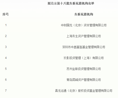 昨天中国证券投资基金业协会还发布了拟公示第十八批失联私募机构名单,涉及中财国龙、务生资产、中鑫富盈、苏州金联投资等公司。