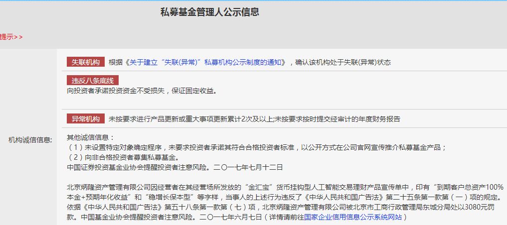 除此以外,基金君还从协会官网看到,炳隆资产在其经营场所发放“金汇宝”货币挂钩型人工智能交易理财产品宣传单,印有“到期客户总资产100%本金+预期年化收益”和“稳增长保本型”等字样,公开宣传推介私募产品,向非合格投资者募集。炳隆资管因违反广告法,被罚款3080元。
