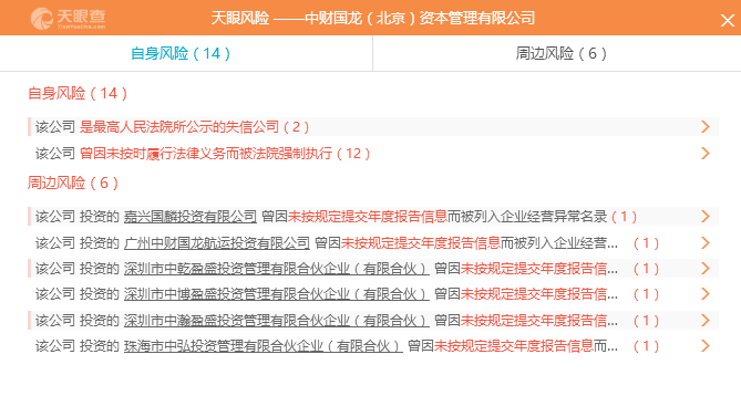 中财国龙(北京)资本管理有限公司的备案信息显示,公司成立于2015年3月23日,备案于2015年5月1日,但公司注册资本3.6亿,实缴为0%,等于是空壳公司。