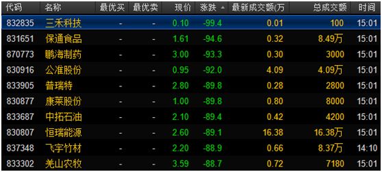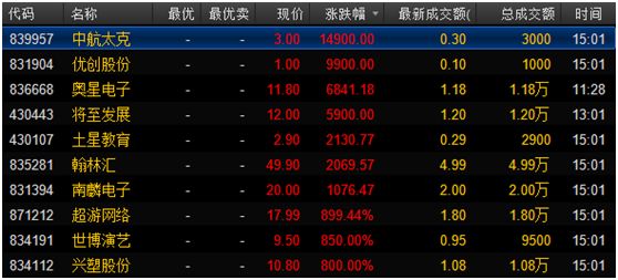 其中,今日以涨幅14900%居集合竞价榜首的中航太克,收盘价为3元/股,但仅成交1000股,成交额3000元。跌幅99.4%的三禾科技,收盘价为0.1元/股,也仅成交1000股,成交额100元。