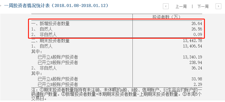在去年12月市场持续低迷之后,新增投资者的数量终于在上周有了明显的增长。截至上周末,投资者数量为1.34亿,其中自然人1.34亿,非自然人36.24万。