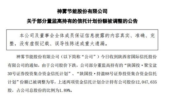 今日,神雾节能发布公告称,今日收到陕西省国际信托股份有限公司的通知,由于公司股价下跌,信托财产净值已低于止损值,并未按时足额追加增强信托资金,公司部分董监高持有的“陕国投·聚宝盆30号”、“陕国投·持盈88号”份额已被调整为零。