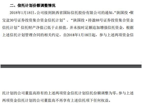神雾节能今日发布公告称,2018年1月18日,公司接到陕西省国际信托股份有限公司的通知,“陕国投·聚宝盆30号证券投资集合资金信托计划”、“陕国投·持盈88号证券投资集合资金信托计划”信托财产净值已低于止损值,并未按时足额追加增强信托资金,根据上述信托计划管理合同的相关约定,自2018年1月18日起,参与上述两项资金信托计划的公司董监高持有的上述两项资金信托计划信托份额调整为零,参与上述两项资金信托计划的公司董监高不再享有上述信托项下任何权益。