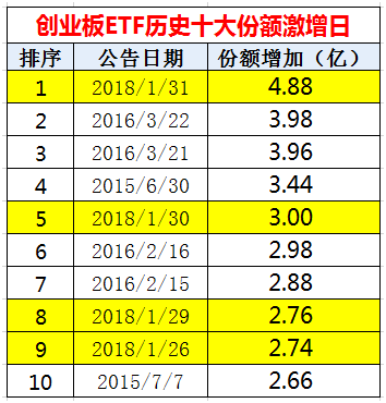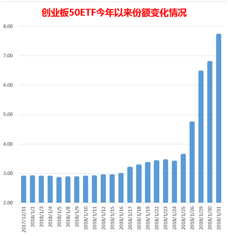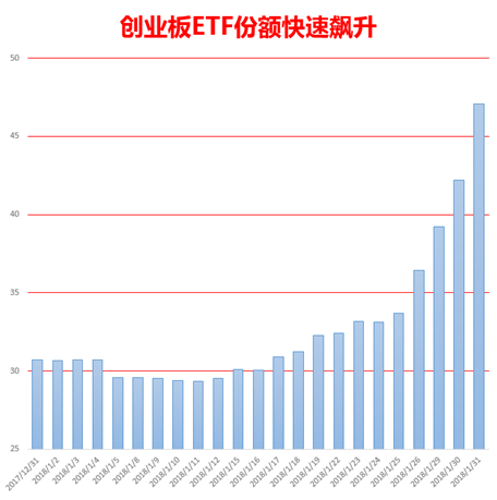 2018年1月25日创业板ETF的份额只有33.7亿份,而到了1月31日公布的份额激增到了47.1亿份,短短4个交易日就增加了13.4亿份,增幅接近40%。