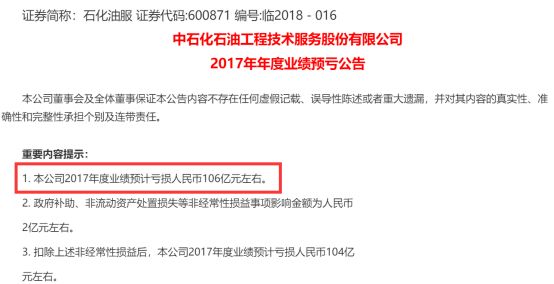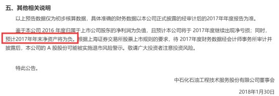 要没有乐视网,石化油服就要连续两年蝉联“亏损王”了,业绩预告显示去年净利润预亏106亿元。而在2016年石化油服便以亏损161亿元多的A股“亏损王”,连亏两年,净资产都要为负了,石化油服可能被实施退市风险警示。今日收盘,石化油服跌幅达8.93%,单日市值蒸发35.28亿。