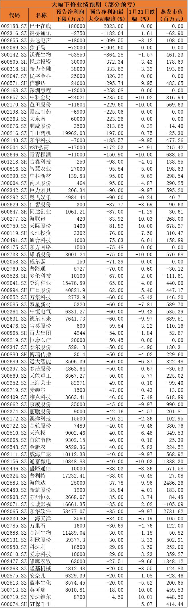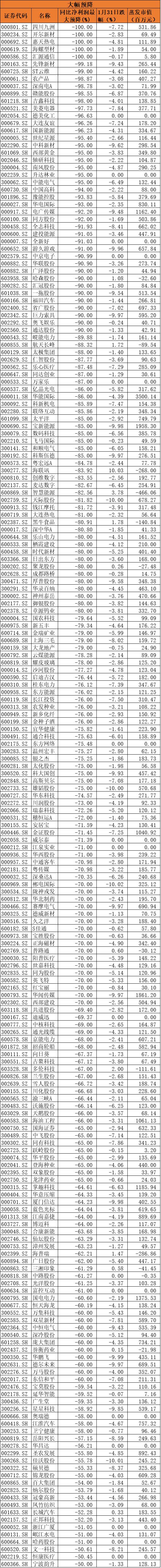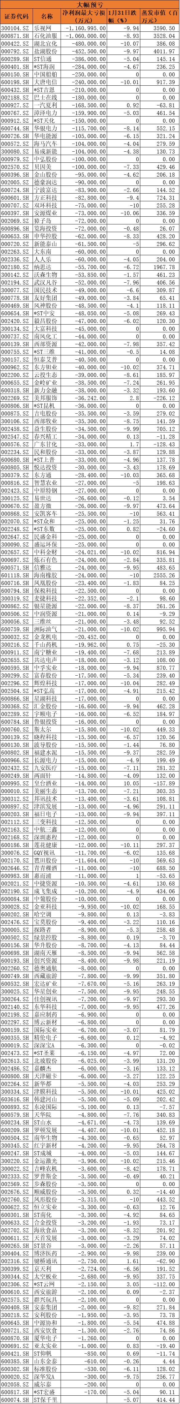 预亏的共有179只股票,包括预亏过百亿的乐视网、石化油服,以及湖北宜化、盐湖股份、ST信通、*ST海润、中国船舶、大唐电信、*ST吉恩等大幅预亏的企业。这179只个股中,有129只股票下跌,37只个股跌停。1月31日平均跌幅4.3%,市值共蒸发480亿元。