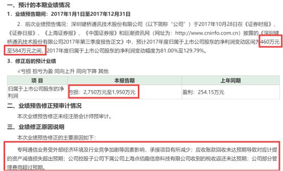 “变脸”幅度最大的是巴士在线,此前预计2017年全年实现盈利1.64亿元-2.1亿元,结果转头就变脸,预计全年净利润亏损15.00亿元至18.00亿元,调整幅度2023.06%。而原因就是上市公司的法人代表王献蜀失联。但股票今天并没有跌停,因为公司已经停牌……