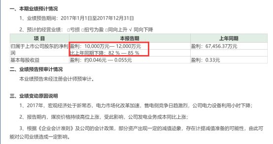 预计业绩下滑的宝新能源股价也在今天跌停,其公告称,受到市场竞争加剧,煤炭价格上涨等影响,去年业绩将下滑82%-85%。