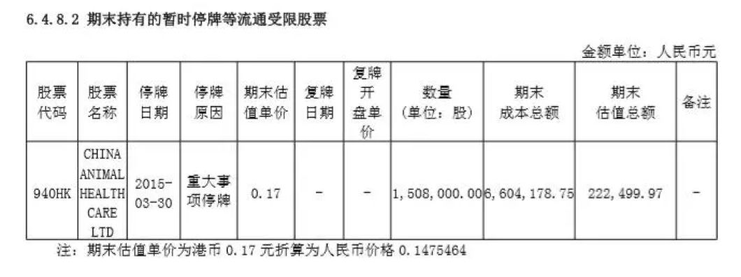 中国动物保健品自2015年3月停牌之前被多只QDII基金持有,股票停牌近三年,迟迟未见复牌,期间基金只能以下调估值方式应对。