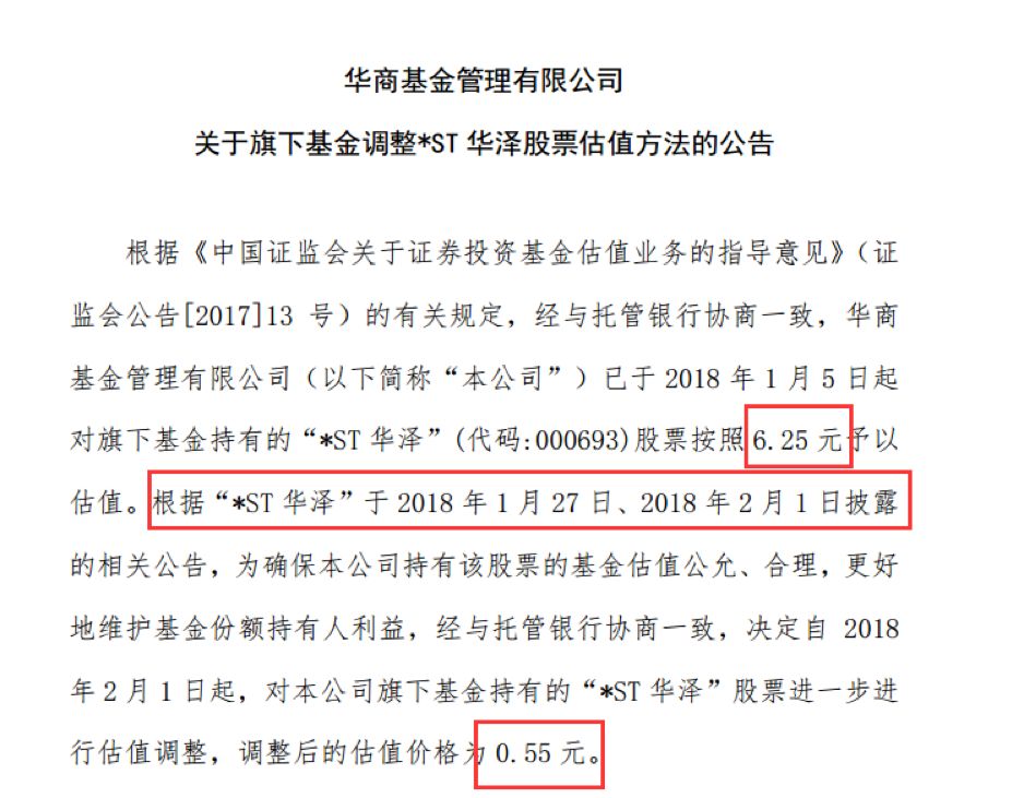 今日,华商基金发布公告称,自2018年2月1日起,对本公司旗下基金持有的“*ST华泽”股票进一步进行估值调整,调整后的估值价格为0.55元。