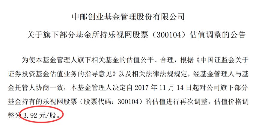 2017年11月15日,多家基金公司公告显示,乐视网再下调50%,估值价格调整为3.92元。加上之前的重估价7.82元。