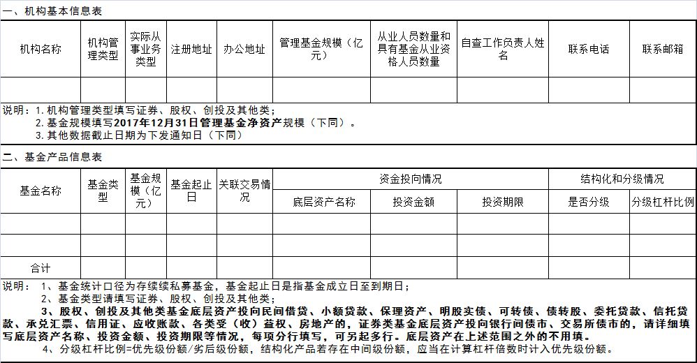最后,基金君还是奉上本次自查内容,《私募机构2018年自查工作底稿(指引)》、《私募机构及产品信息表》等。