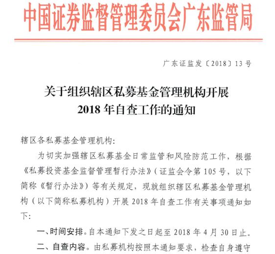 近期,广东证监局发布《关于组织辖区私募基金管理机构开展2018年自查工作的通知》,拉开了2018年私募机构自查工作的序幕。自查底稿包括6大项、56小项清单,包括私募宣传推介、资金募集、基金投资、内控及风险管理、信息披露与报送、《适当性办法》自查等,要求在4月30日之前完成。