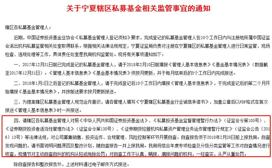同时,宁夏证监局2月1日也发布《关于宁夏辖区私募基金相关监管事宜的通知》,涉及管理人基本信息、基金产品基本情况、适当性自查等四个方面。要求在2月28日前上报。