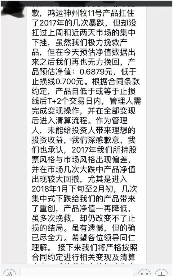 据网上流传的神州牧基金的致歉信显示:“鸿运神州牧11号产品扛住了2017年的几次暴跌,但却没扛过上周和近两天市场的集中下挫,虽然我们极力挽救产品,但在今天预估净值数据出来之后再也无力挽回,产品预估净值:0.6879元,低于止损线0.700元。根据合同条款约定,产品自低于或等于止损线后T+2个交易日内,管理人需要完成变现操作,并在全部变现后进入清算流程。”
