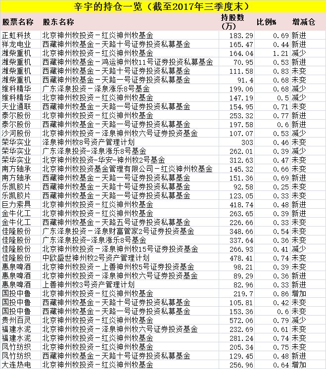 我们来看看辛宇的最新持股情况,据不完全统计,辛宇旗下的产品出现在19家上市公司三季报的十大流通股东名单中,包括福建水泥、佳隆股份、凤竹纺织等,其中不少个股都是壳资源股票。