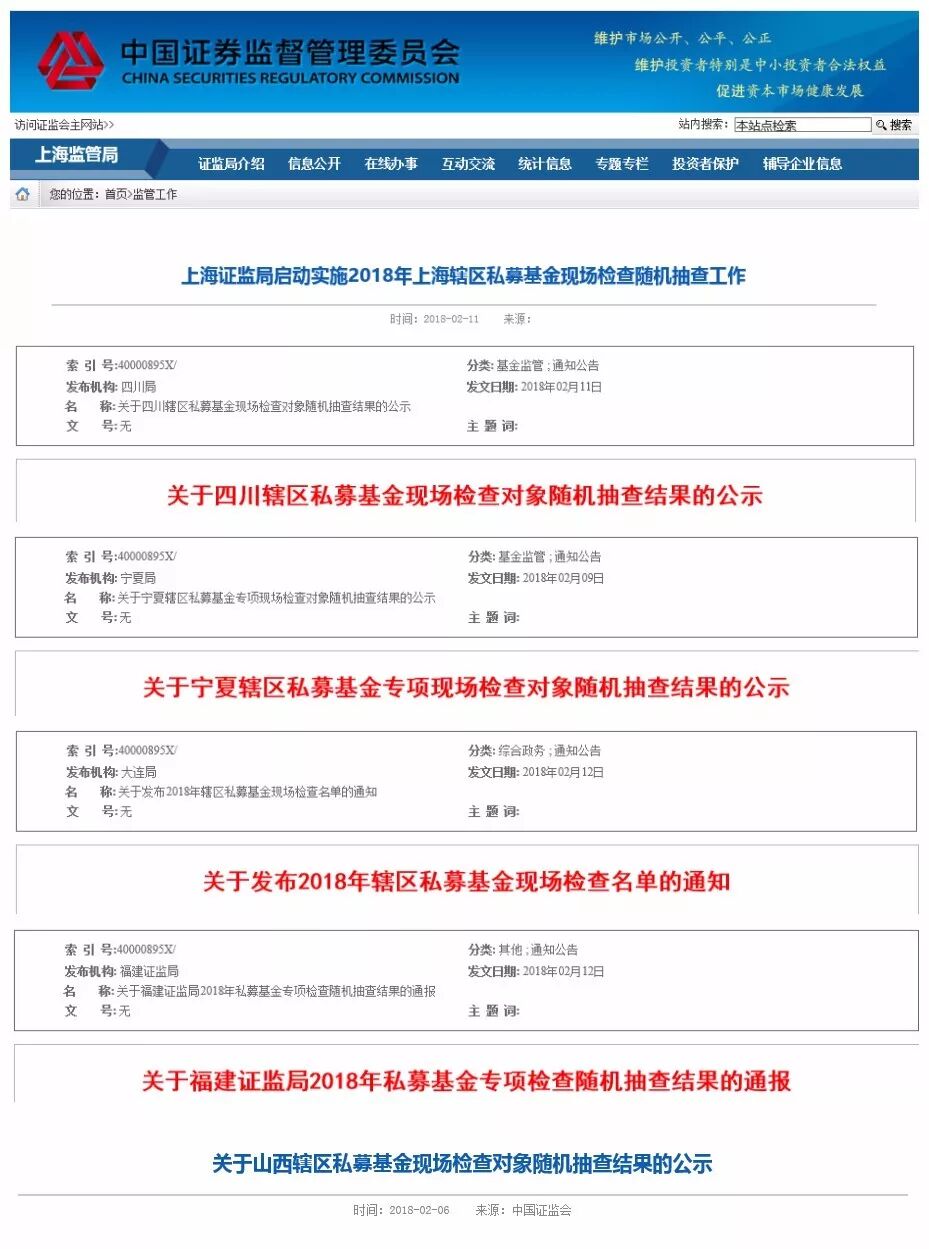 为贯彻落实《国务院办公厅关于推广随机抽查规范事中事后监管的通知》(国办发[2015]58号)和《中国证监会随机抽查事项清单》(证监会公告[2015]25号)相关要求,按照证监会关于2018年私募基金专项检查的工作部署,近期各地证监局陆续启动了2018年私募基金专项检查工作。