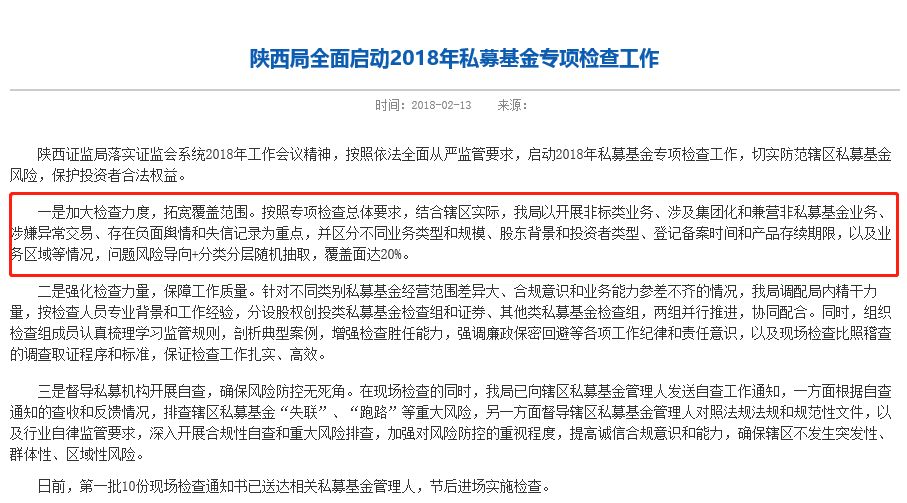 2月13日,陕西证监局发文表示全面启动2018年私募基金专项检查工作,第一批10份现场检查通知书已送达相关私募基金管理人,节后进场实施检查。