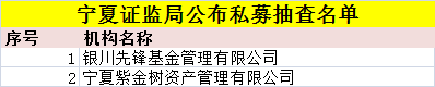 2月9日,宁夏证监局也公布了抽查私募机构名单,包括银川先锋基金、宁夏紫金树资产两家机构。