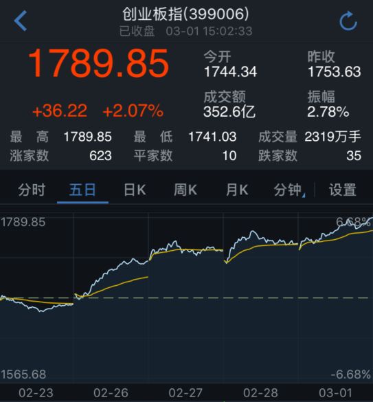 本周以来,创业板表现强势走出四连阳。2月26日,创业板指放量大涨3.61%重回1700点,创下7个月来最大单日涨幅。接下来的两个交易日,创业板继续飘红。今天创业板表现依然强势, 国产软件、工业互联网等科技题材全线爆发,带动创业板指大涨超过2%。
