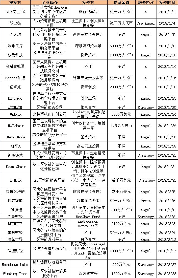 2018年前两月获得市场融资的区块链项目,情况如下: