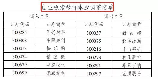 根据公告显示,国瓷材料、中际旭创等6家公司将调入创业板指数样本股,新宙邦、数字政通等6家公司将调出。被调出的6只股票所占创业板指数权重合计2.24%。