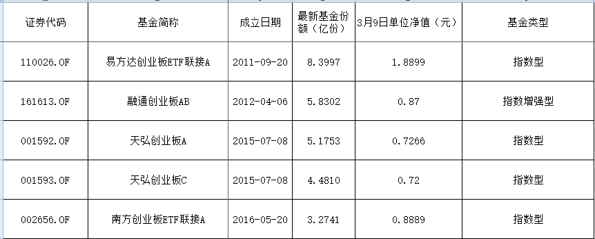 而很多习惯通过银行账户买开发式基金的投资者,则可以通过申购场外开放式的创业板指数基金。这里优选部分成立时间长、份额相对较大的创业板指数基金。