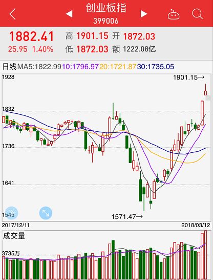 延续近期的强走势,主要指数跳空高开,创业板指数跳空冲高一度站上1900点,而后有所回落,到收盘报1882.41点,涨1.4%。成交额1222.08亿元,成交量74.7亿股,一举超过2015年11月12日的74.16亿股,创出历史最高成交量。
