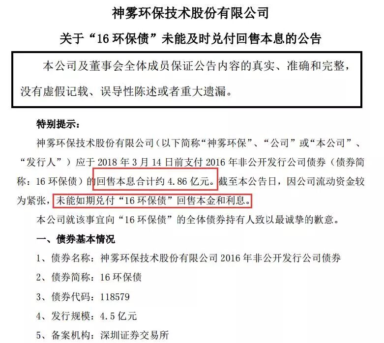 昨晚,神雾环保(300156)公告称,因公司流动资金较为紧张,未能如期兑付“16环保债”回售本金和利息,共计约4.86亿元。