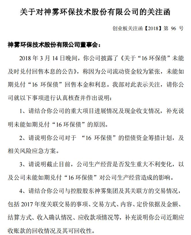 针对“16环保债”违约,深交所对神雾环保下发了关注函,要求公司说明未能如期兑付债券的原因、资金筹措计划及相关应急方案,并对公司经营变化、关联方交易情况、对外融资情况和资产运营情况进行说明,还询问了公司是否存在应报告未报告、应披露未披露的风险情形。