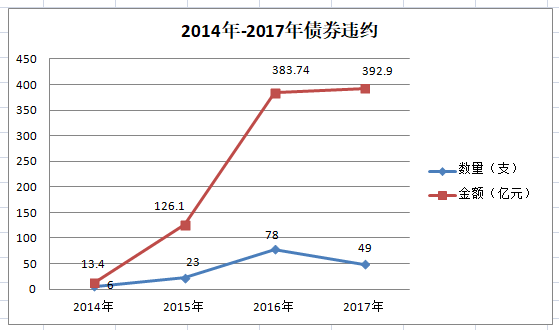 2017年,债券违约金额为392.9亿元,与2014年的13.4亿元相比,暴增28倍!