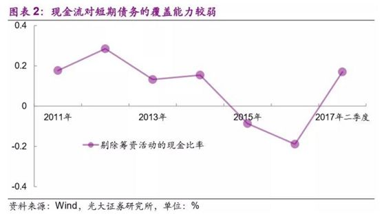 神雾集团的运转对外部融资的依赖性较强,2015、2016年的经营活动现金净流出额度较大,而后续的回款并没有明显的改善,现金流对短期债务的覆盖能力仍然较弱。如下图:
