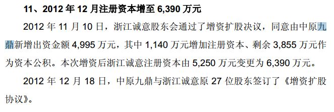 诚意药业招股说明书显示,2012年11月 10 日,浙江诚意股东会通过了增资扩股决议,同意由中原九鼎新增出资金额 4,995 万元,其中 1,140 万元增加注册资本、剩余 3,855 万元作为资本公积。