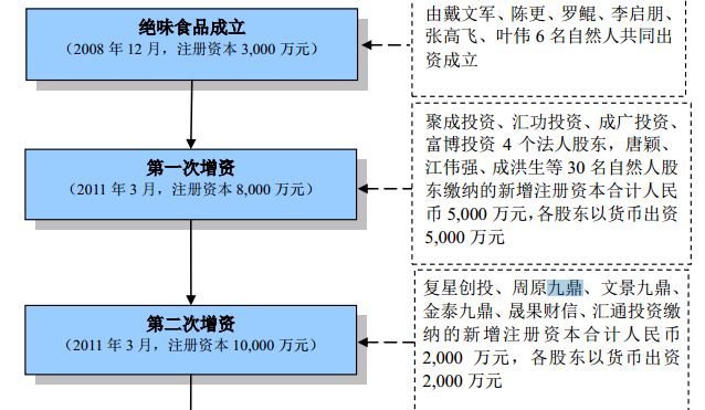 绝味食品的IPO招股说明书显示,2011年3月9日,复星创投、 周原九鼎、文景九鼎、金泰九鼎、晟果财信、 汇通投资等六家企业以现金按 13.00 元/股的价格认购,其中周原九鼎、文景九鼎、金泰九鼎分别持有450万股、300万股、150万股,合计900万股,算一算当时花的成本仅为1.17亿元。