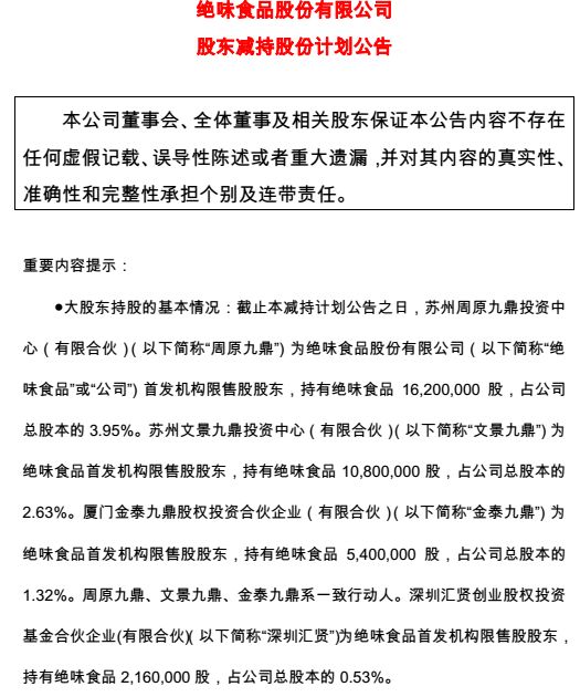 先来看绝味食品,18日公告,九鼎系旗下的4家公司周原九鼎、文景九鼎、金泰九鼎以及深圳汇贤,拟减持不超过持有绝味食品 34,560,000 股,即不超过总股本的 8.43%。其中,周原九鼎、文景九鼎、金泰九鼎是一致行动人。