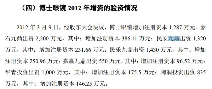 其实,早在2012年3月,博士眼镜增资引入了九鼎投资,九鼎旗下的豪石九鼎、民安九鼎、民乐九鼎、嘉赢九鼎等四个出资主体合计出资5500万元,获得博士眼镜15%的股份。
