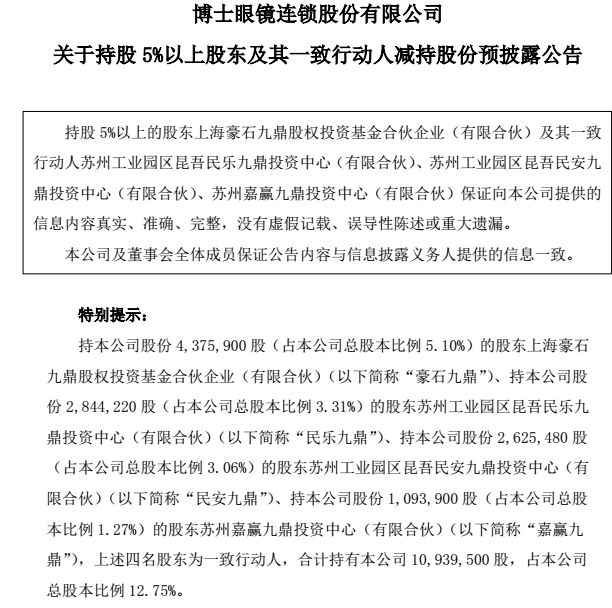 再来看看博士眼镜,16日公告,九鼎系旗下的豪石九鼎、 民乐九鼎、 民安九鼎、 嘉赢九鼎4家公司拟减持共计不超过 9,652,500 股,即不超过公司总股本的 11.25%。今天博士眼镜低开低走,收盘跌幅2.1%。