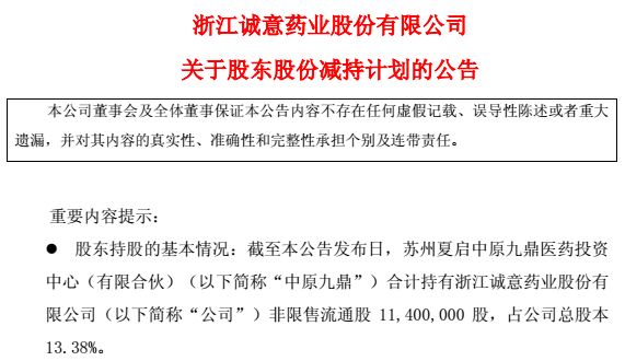 还有诚意药业,16日公告,九鼎系旗下中原九鼎拟减持数量合计不超过11,400,000 股,即不超过公司总股本的 13.38%。诚意药业今天收盘26.64元,微跌0.37%。