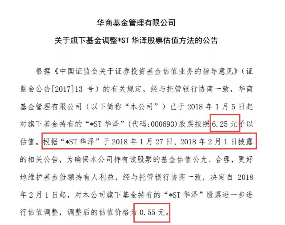 事实上,自*ST 华泽2月1日收到证监会处罚决定书以后,陆续被华商基金、招商基金、银华基金、华富基金、大成基金、鹏华基金、摩根士丹利华鑫基金等九家公募基金下调估值。其中,除了华商基金、鹏华基金将该股估值下调至0.55元以外,大部分公募基金下调该股估值至1元左右。